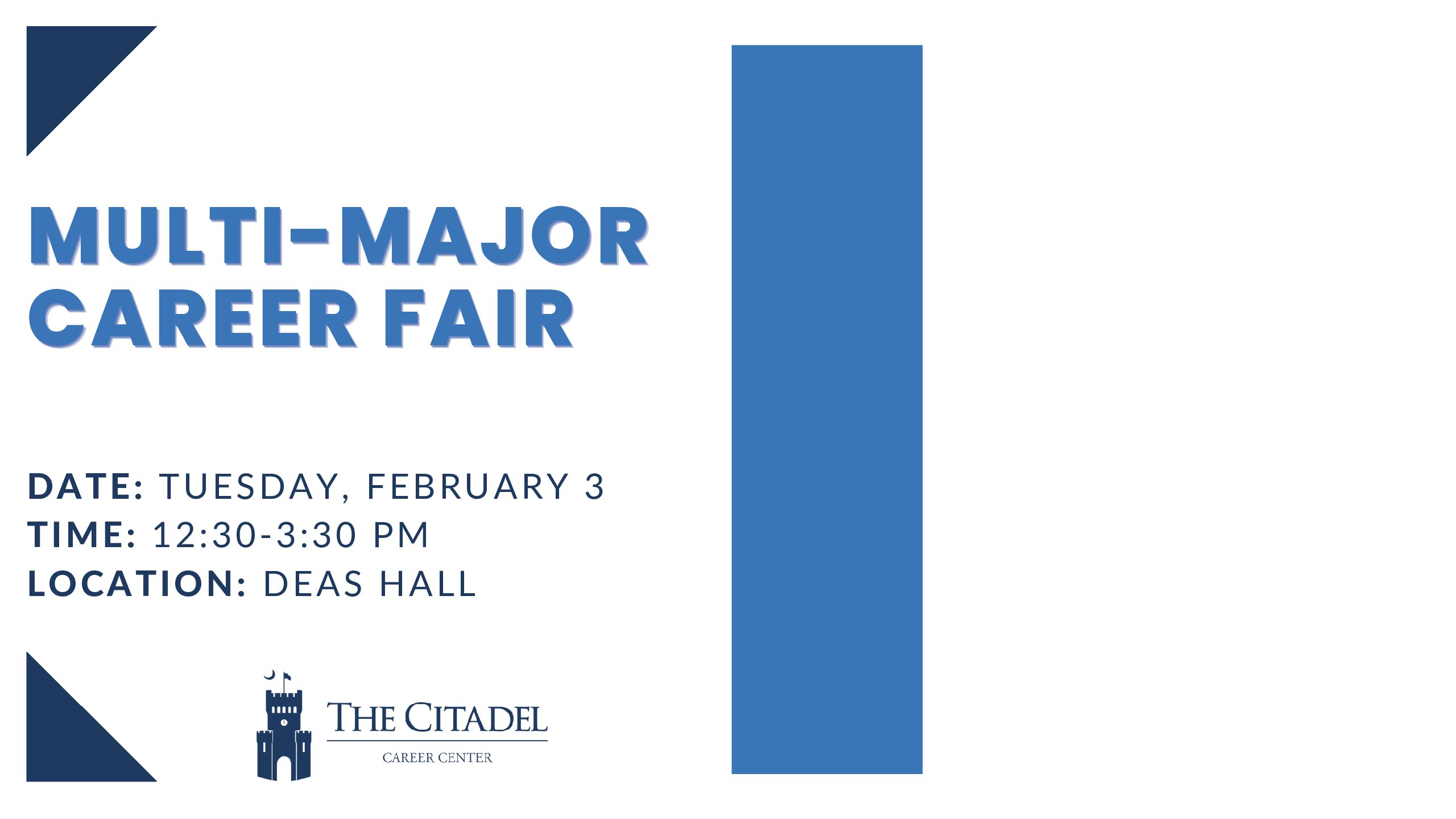 ![]() We will have over 60 companies coming to campus to hire YOU! Ranging from full-time positions to summer internships, these employers want to hire Citadel Students. See you in Deas Hall! |