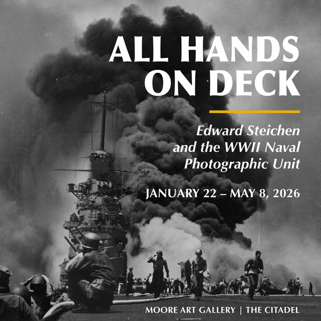 Drawn from both their archives and a recent gift from the Museum of Modern Art to Patriots Point Naval & Maritime Museum, this exhibit was curated by Tiffany Reed Silverman with the generous collaborative support of the staff of Patriots Point Naval & Maritime Museum, especially Meredith Kablick, Miranda Helton, Colby Causey, Joe Bosco, and Kenny Brinckman and Citadel interns Camden Hom and Aidan Wiseman. Additional support was provided by Pinnacle Bank and the Friends of Fine Arts at The Citadel.