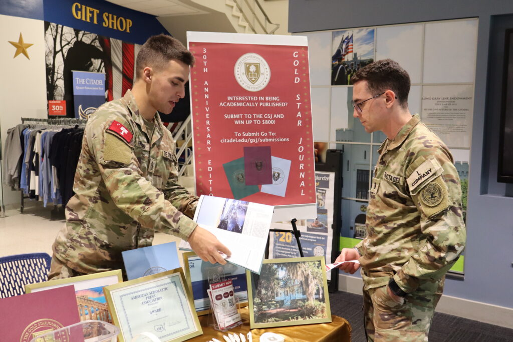 The GSJ gives students the opportunity to share their work with the greater Citadel community. Selected nonfiction papers demonstrate effective writing, research skills, and critical thinking. Featured artwork (drawings, paintings, photographs, and photo stories) commemorates the life of Citadel students both on and off campus. Photo stories depict experiences mostly through photographs, drawings, and/or paintings with optional and minimal prose. The Journal is published annually for Corps Day, which occurs in mid-March. Please consider submitting your work to The Gold Star Journal.