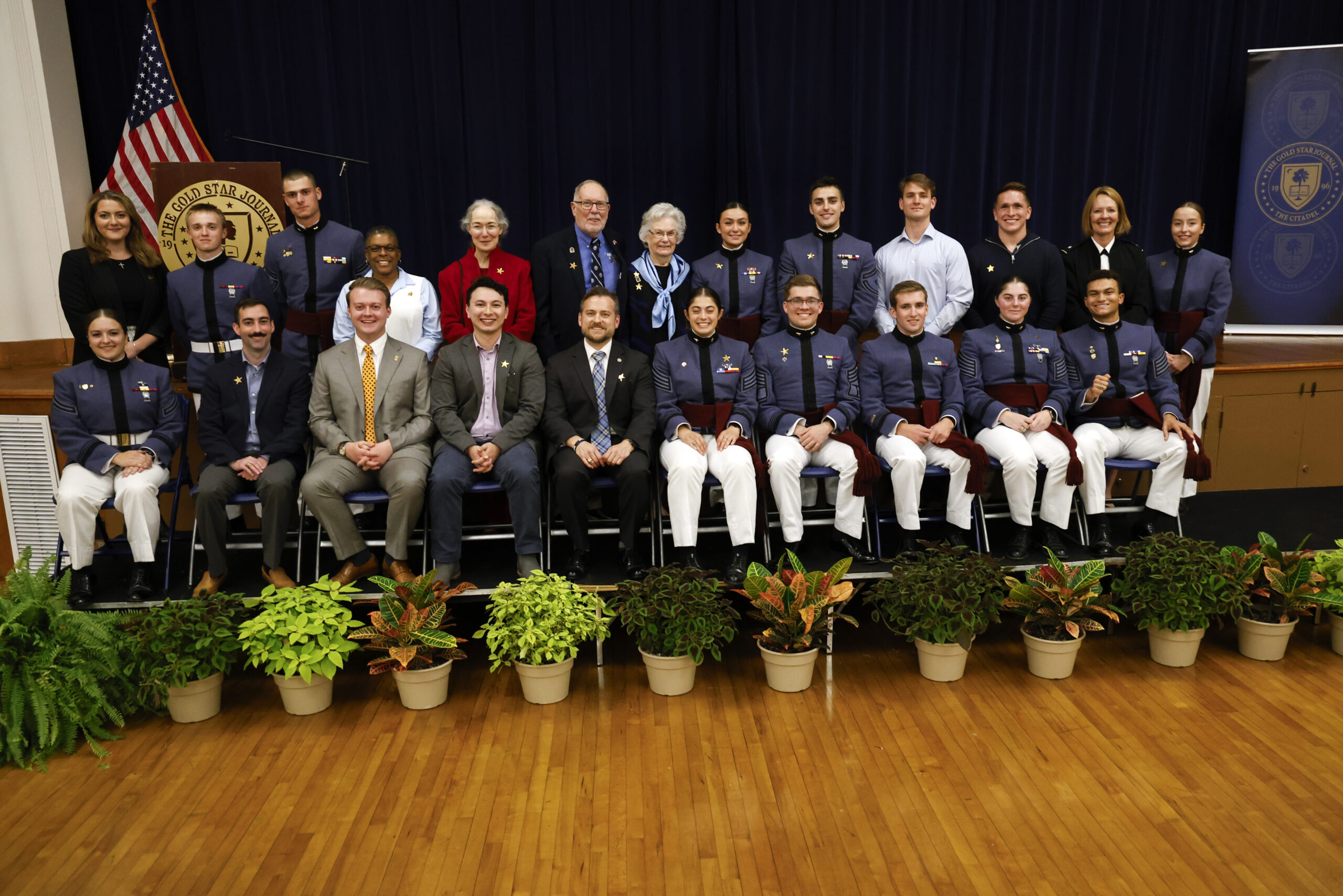 Pictured from left to right: Top Row: Fabiana Paolini, (Graduate Assistant), Patrick Burns, (Marketing Editor), Quentin Walsh, (Editor), Barbara Hill, (Former Author), Dr. Suzanne T. Mabrouk, (GSJ Advisor), LTC Steve Hodges, ’63, Mrs. Noreen Hodges, Kanjanika Kincaid, (Assistant Editor-in-Chief), Luke Frazier, (Communications Editor), Gage Timberlake, ’25 (Panelist), Ken Galsgaard, ’23 (Panelist), Dr. Sally Selden, (Provost), Olena Fedinova (Design Editor).