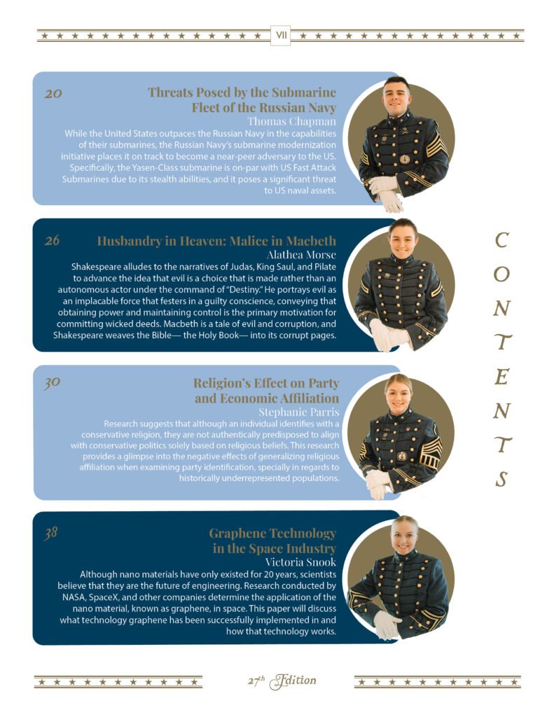 Colonel and Mrs. Abraham Goldfarb (Class of 1960) provide funds for printing The GSJ in color. This is the second edition to be printed in color.