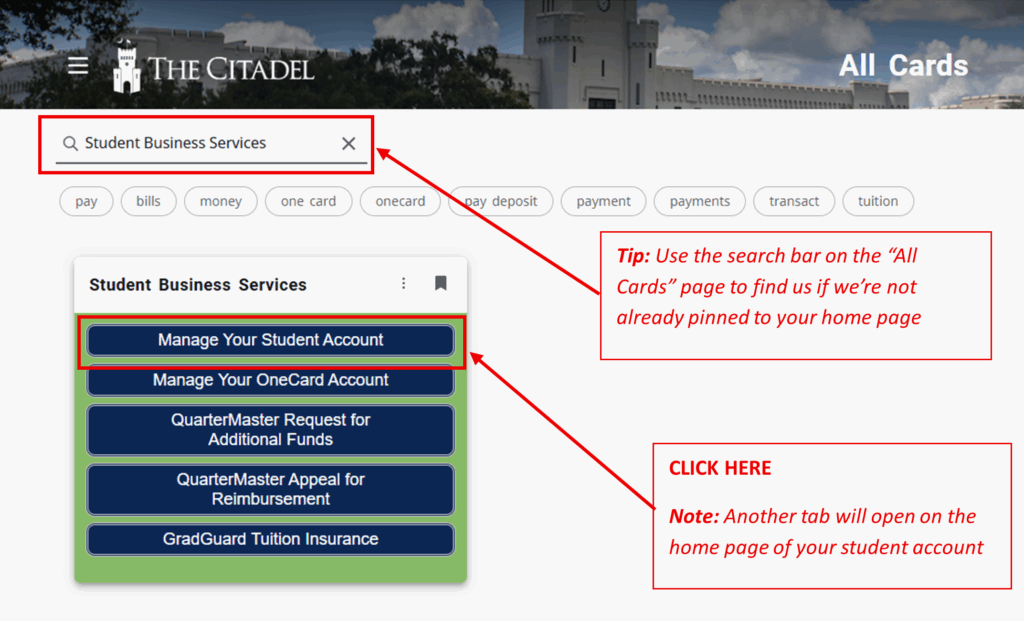 Go to my.citadel.edu and search for the “Student Business Services” card. Click on “Manage Your Student Account”.