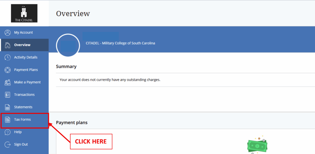On the “Tax Forms” page, you will see any 1098-T forms that have been issued to you during your time here at The Citadel (from 2022 onwards). The most recent form issued will be on top. To view the form, click “View”. To save the form to your device, click “Save”.