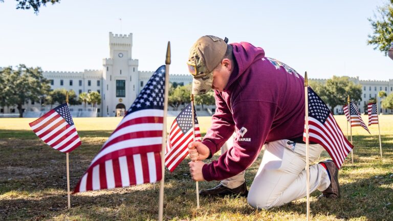 For this year’s Veterans Day, The Citadel chose a new way to pay tribute to those who have served our country — with a powerful display of American flags, placed along Summerall Field, each dedicated in honor of a veteran or active-duty service member.